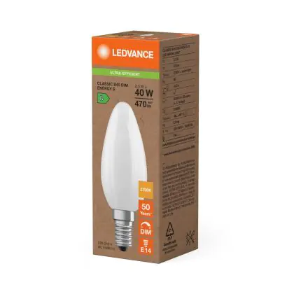 Description Ledvance Classic LED E14 Bougie Dépolie 2.5W 470lm - 827 Blanc Très Chaud | Dimmable - Remplacement 40W
