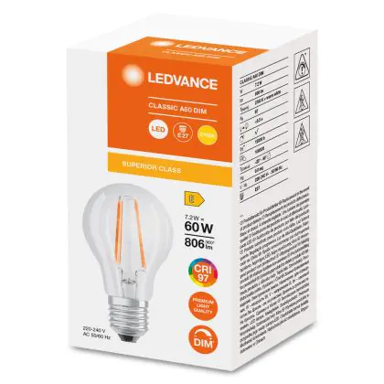 Cette ampoule Ledvance Classic LED E27 Poire Filament Claire 7.2W 806lm - 927- | Meilleur rendu de couleur - Dimmable - Remplacement 60W avec son efficacité lumineuse de lumen par watt vous permettra de profiter d’un éclairage de qualité. Avec sa durée de vie de 15000 heures, vous n’aurez pas à vous soucier de son remplacement avant quelques années.