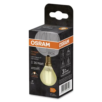 Cette ampoule Osram Vintage 1906 LED E14 Boule Filament Dorée 4W 420lm - 825 | Remplacement 35W avec son efficacité lumineuse de lumen par watt vous permettra de profiter d’un éclairage de qualité. Avec sa durée de vie de 15000 heures, vous n’aurez pas à vous soucier de son remplacement avant quelques années.